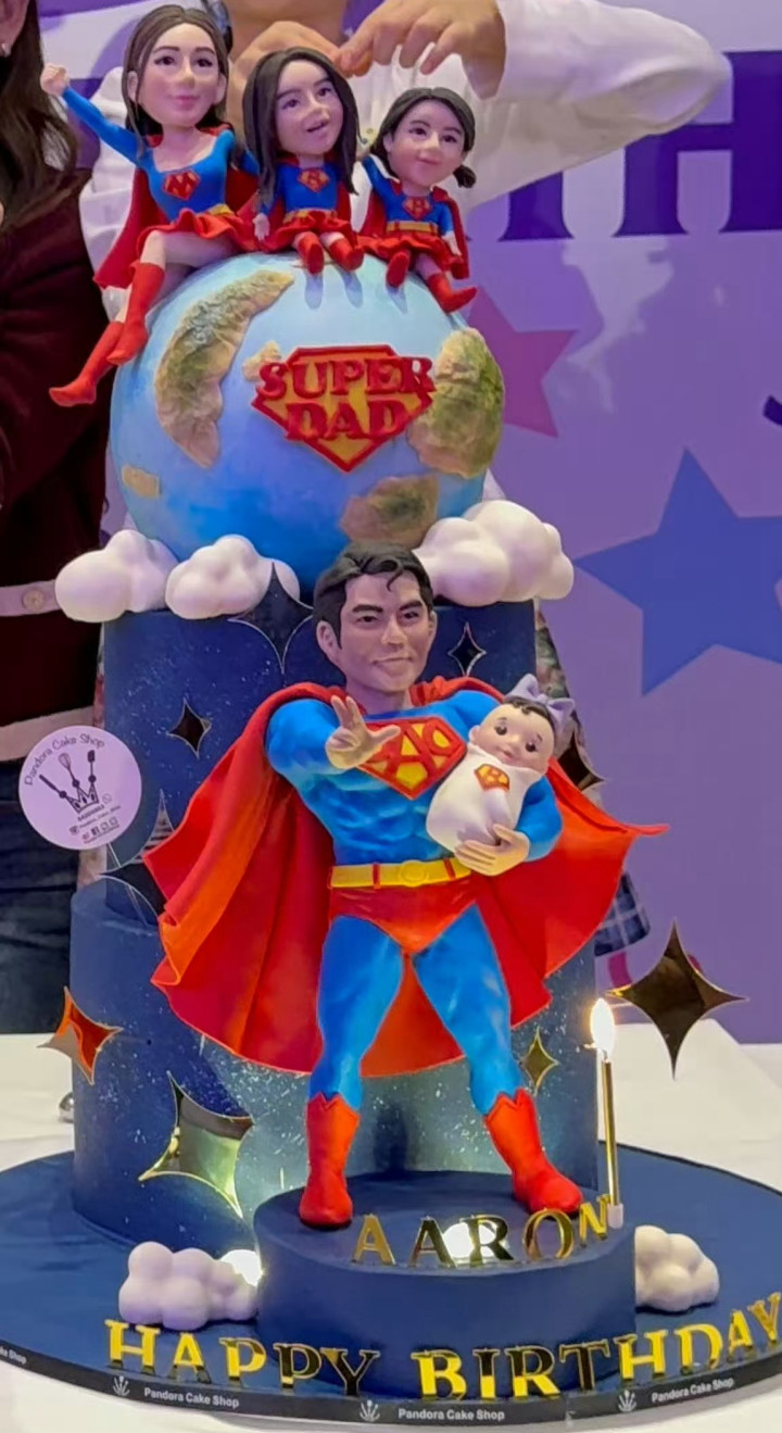 这场生日派对最戳人的是方媛准备的定制蛋糕,蛋糕把一家五口都设计成了“超人家族”造型。