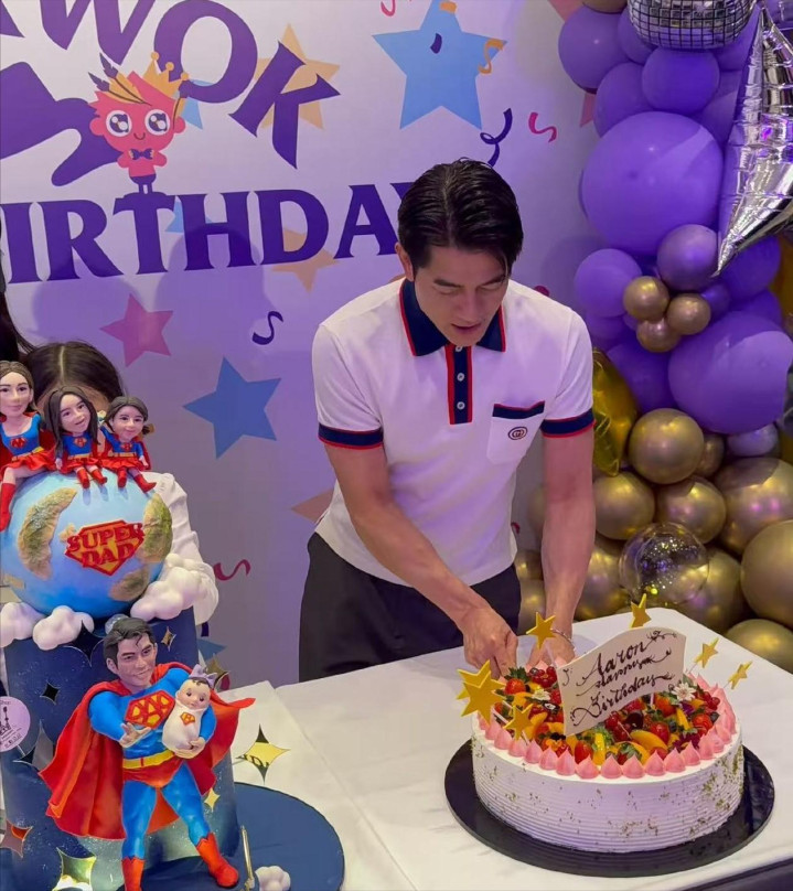 两个蛋糕的设置更显贴心,一个多层祝寿款给寿星,一个带超人玩偶的童趣款照顾两个女儿的喜好。