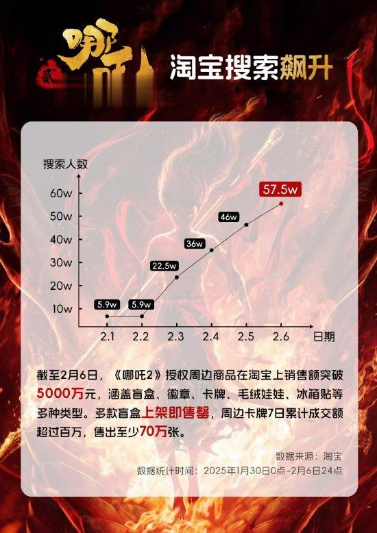 新浪科技讯2月8日下午消息,从淘宝了解到,目前平台上由饺子创作的哪吒系列形象授权周边在平台上销售额已经突破了5000万。其周边种类也覆盖了盲盒、卡牌、毛绒、搪胶娃娃、胶片卡、冰箱贴、徽章、贴纸等数十种,且成交量还在继续飙升。