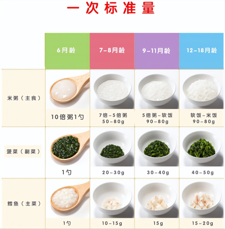 7倍粥50-80g/餐 → 8月龄:5倍粥80-120g/餐(可替换为碎碎面20-30g)